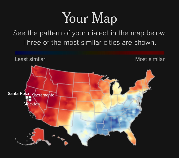 Which is also the problem with that NYT quiz, a lot of those I use more than one of the answers. Fwiw it had me pegged as a Bible belt southerner/Philly resident.